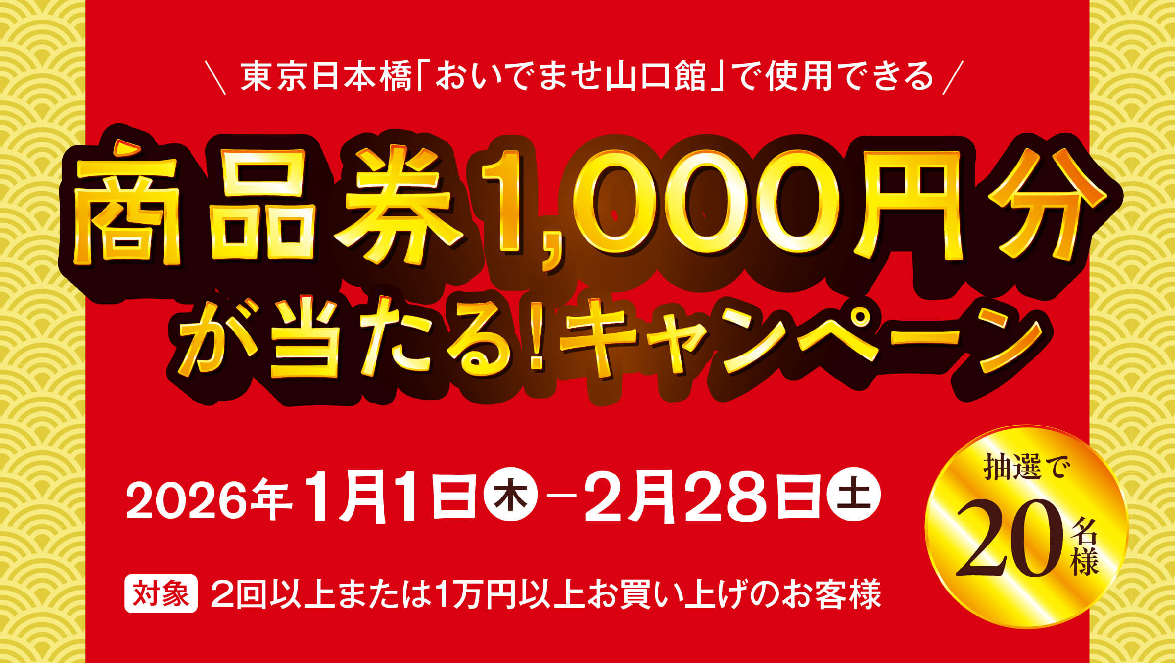 キャンペーン期間中、ECサイト「おんらいん やまぐち館」で2回以上(もしくは1万円以上)お買い上げのお客様から、抽選で20名様に東京日本橋のアンテナショップ「おいでませ山口館」で使える1,000円分の商品券が当たります!